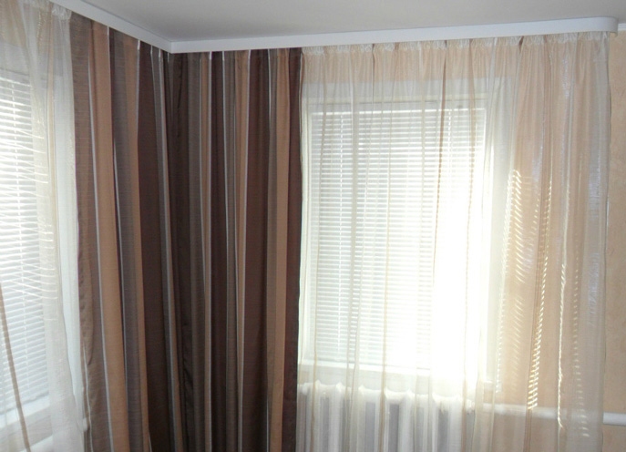 Sudut cornice dalam ruangan dibuat dalam bentuk struktur profil atau batang. Ini tentu mengandung elemen putar yang memungkinkan Anda untuk membuat produk dari berbagai bentuk. Di dalam profil ada alur untuk pelari, di mana pengikat untuk tirai bergerak. Pada tirai bar dapat dilekatkan pada cincin.