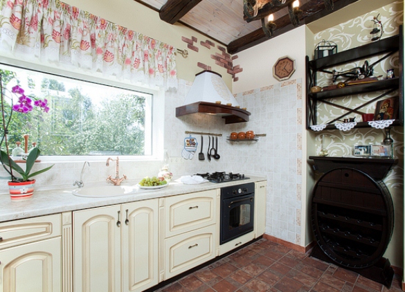 Paling sering dalam desain gaya pedesaan dapur. Tirai warna untuk dapur dengan gaya kasar bisa sangat berbeda: monokrom, bergaris-garis, dalam kotak. Pada gorden dapat digambarkan bunga, sayuran, buah-buahan, dengan kata lain, semua yang menyandang semangat desa. Kain untuk tirai di dapur lebih baik untuk memilih sintetis, tetapi dengan imitasi alami, sebagai tirai alami setelah sering mencuci dan matahari cerah akan segera kehilangan penampilan aslinya. Hari ini Anda dapat memilih kain dengan air khusus dan impregnasi penolak debu, yang akan memperpanjang umur tirai Anda.